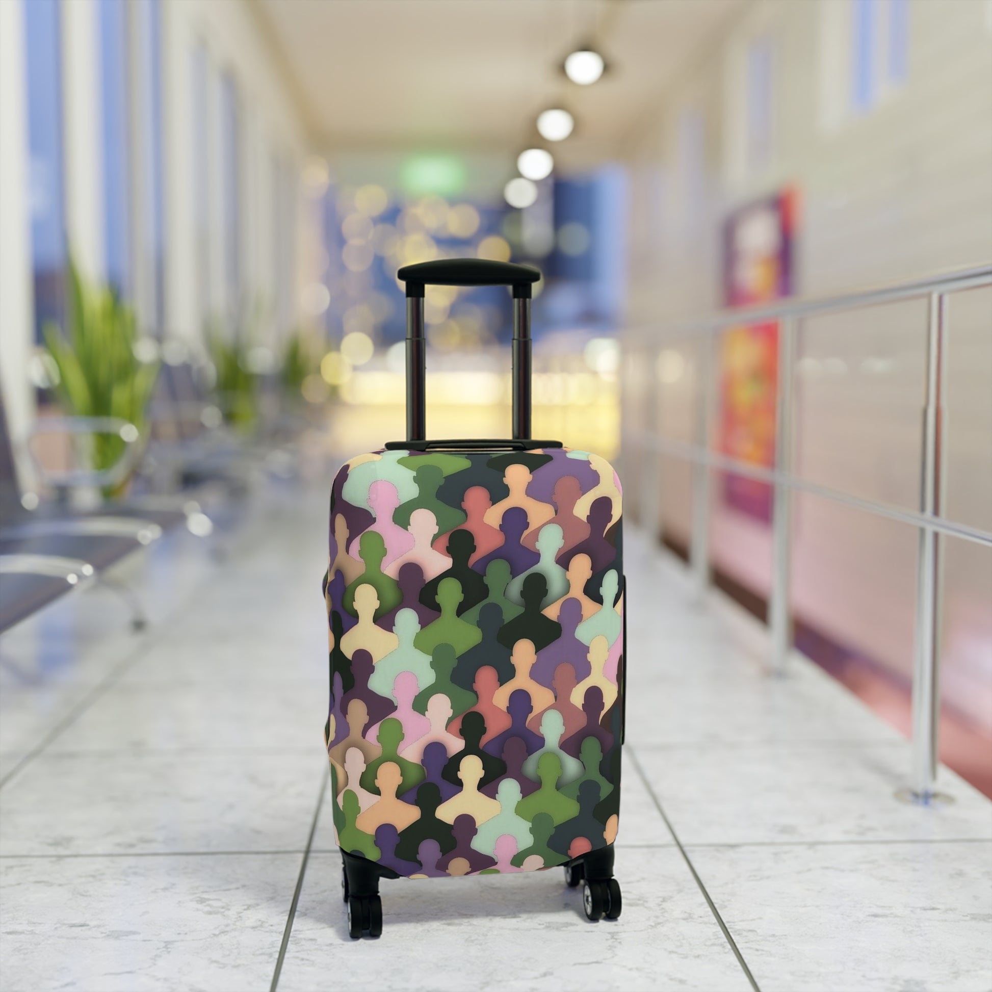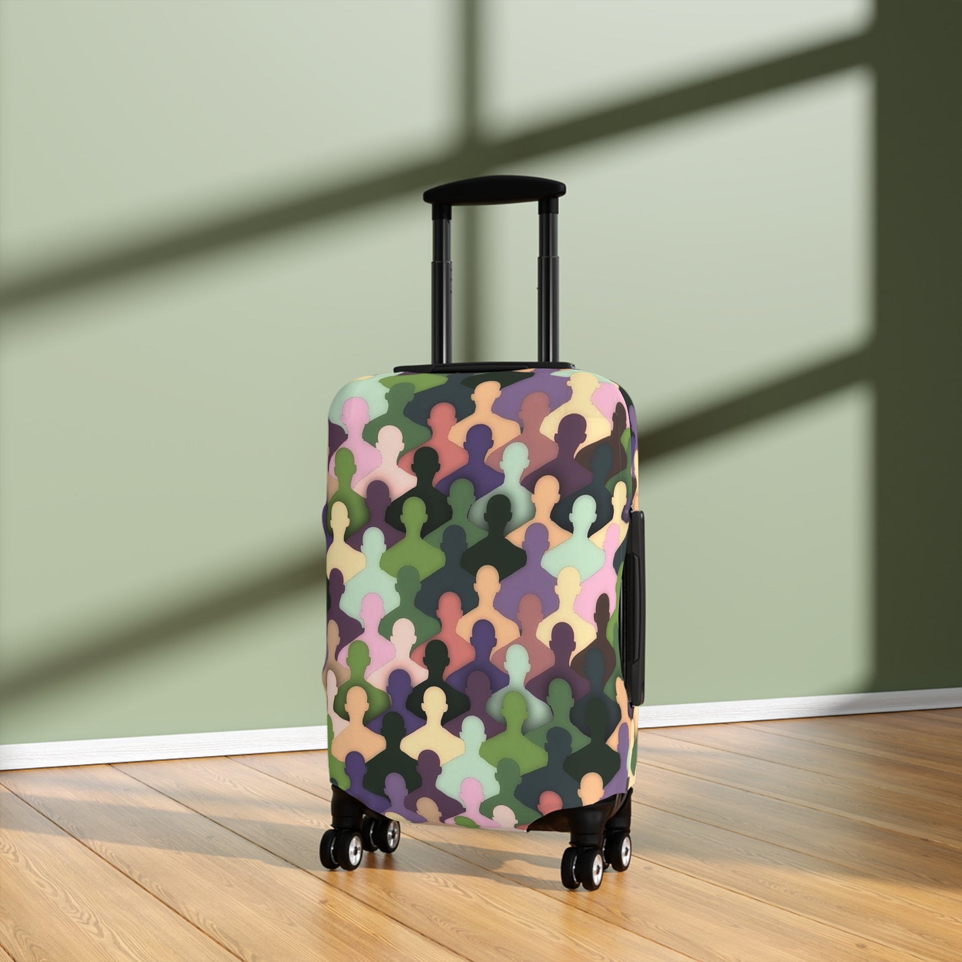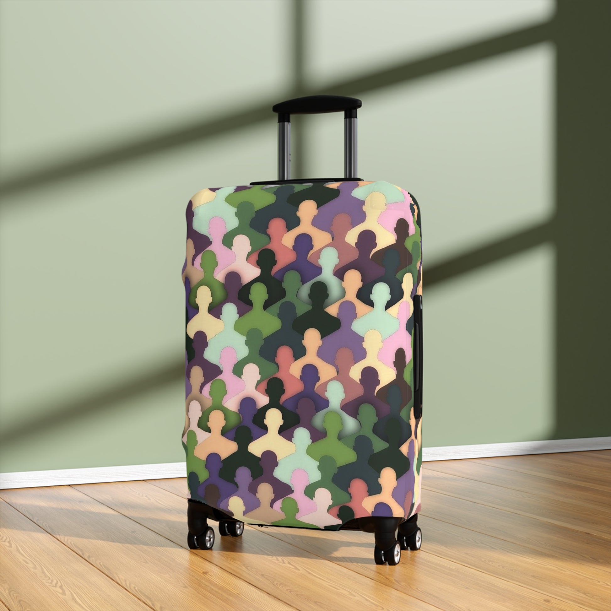 Carry a little personality onto the carousel with this stretch-fit luggage cover. The soft, elastic fabric slips on in seconds and hugs your suitcase like a tailored layer — shielding it from dust, light scuffs, and day-to-day travel wear. The pattern mixes muted pastels and earthy tones into an abstract, crowd-like repeat that reads modern and playful from every angle. Thoughtful details — left-side and top slits for easy handle access and a bottom zipper — keep the cover secure while letting you roll, lift, and check your bag without fuss. It brightens up the airport shuffle and helps you spot your case at a glance.