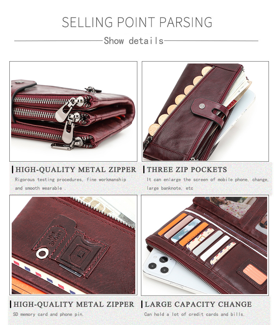 Large Capacity: The wallet is designed with 25 card slots, 2 clear ID windows, 1 zipper pocket, 1 accessory slot (for cash or phone), and 7 receipt slots for versatile storage options.