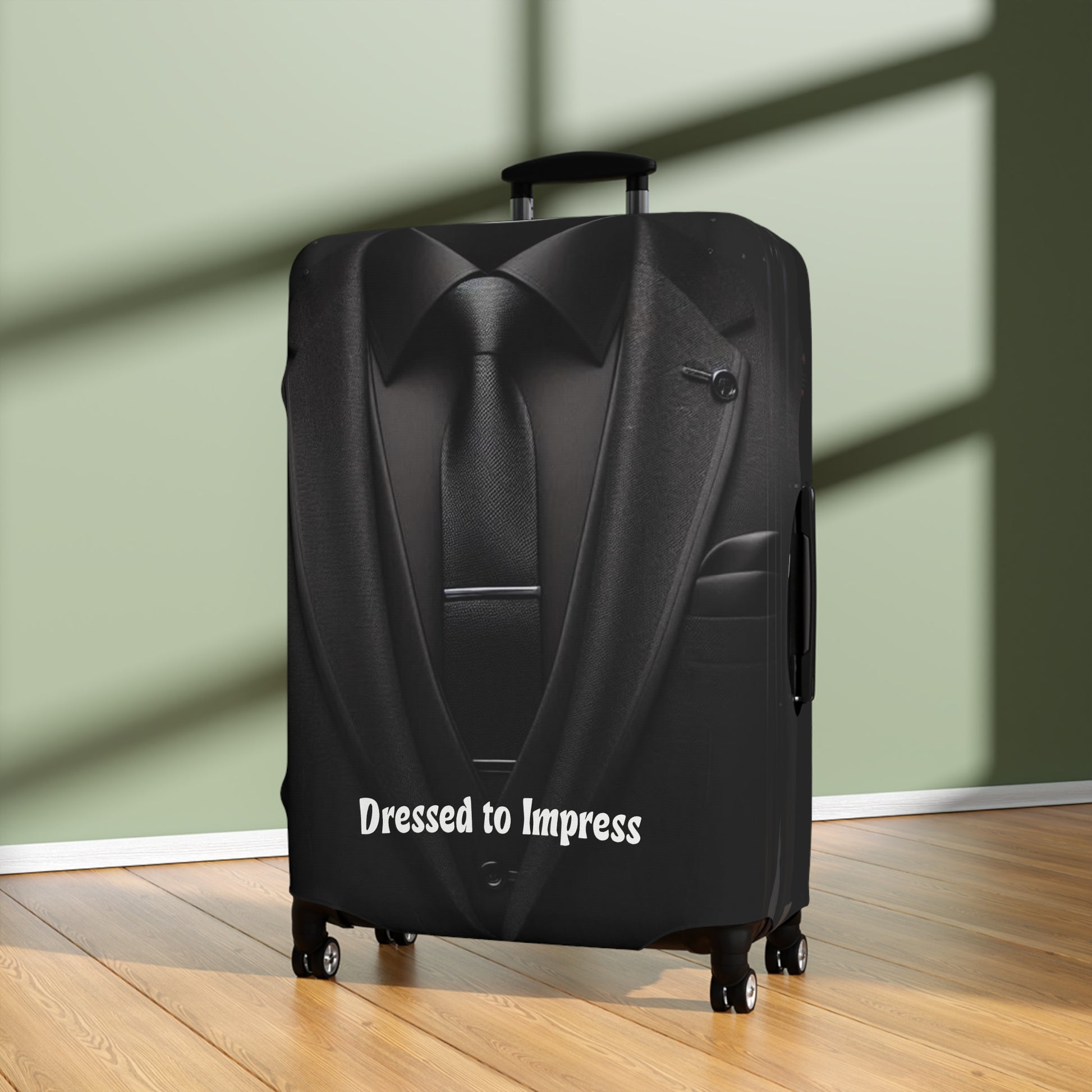 A clever luggage cover designed to look like a tailored black suit and tie. The lightweight stretch fabric protects your suitcase from dust and scuffs while keeping it instantly recognizable at baggage claim. Perfect for business travel or anyone who wants their bag to make a stylish statement.