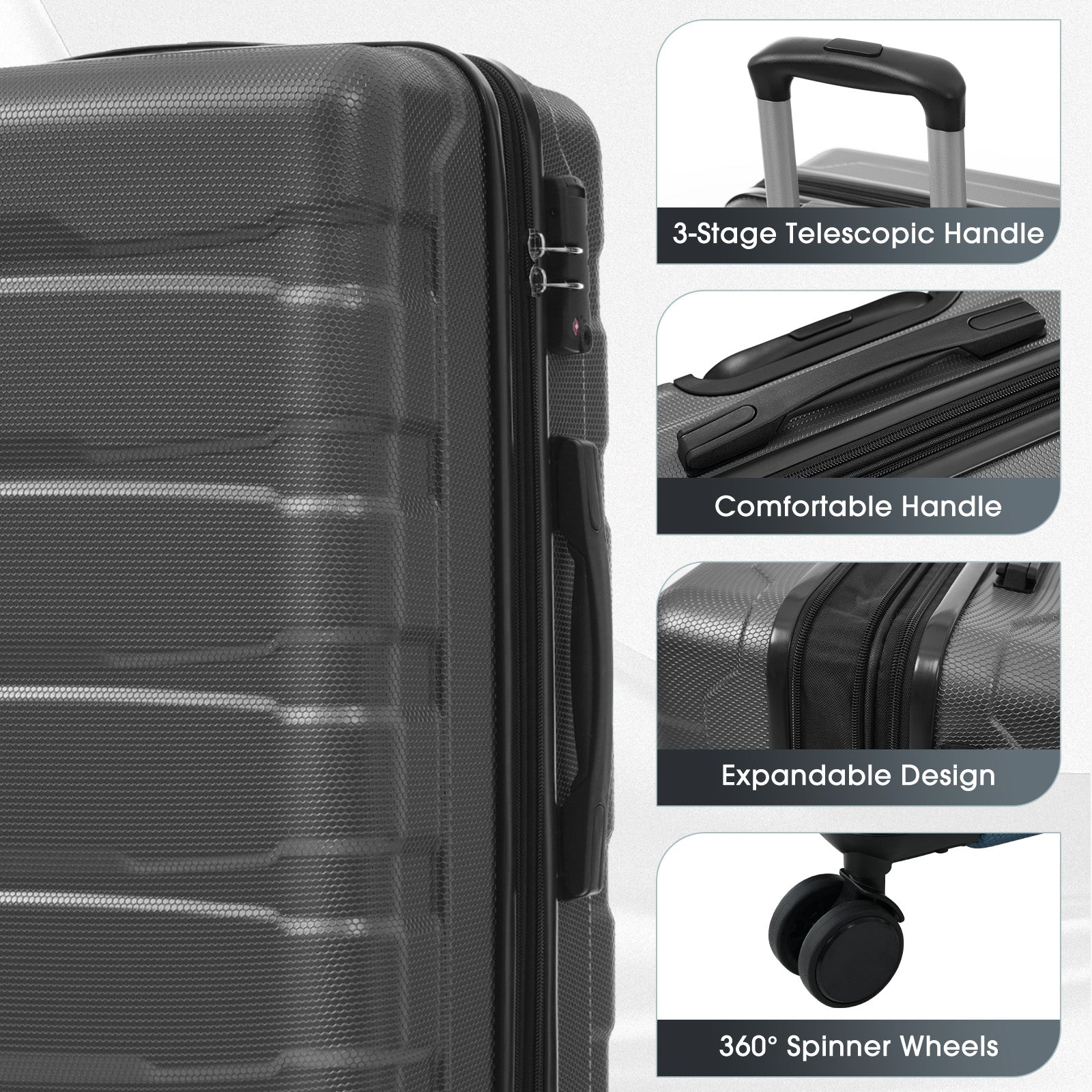 - Smooth Spinner Wheels & Adjustable Handle: Equipped with four 360° spinner wheels, it smoothly maneuvers across various surfaces and directions. The 3-stage telescopic handle adjusts easily to your preferred height for effortless travel.